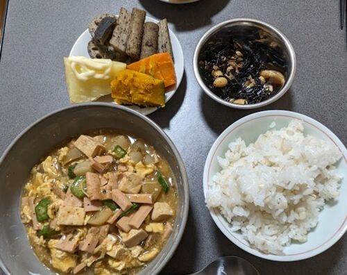 豆腐カレーライス。みそ汁を作るつもりでにぼし粉を炒って、水と豆腐を入れて加熱してた。なんだか濃い味のものが食べたくなったからカレールーとチーズを足した。おしゃれなカフェで食べるカレーみたいになった。成功した。